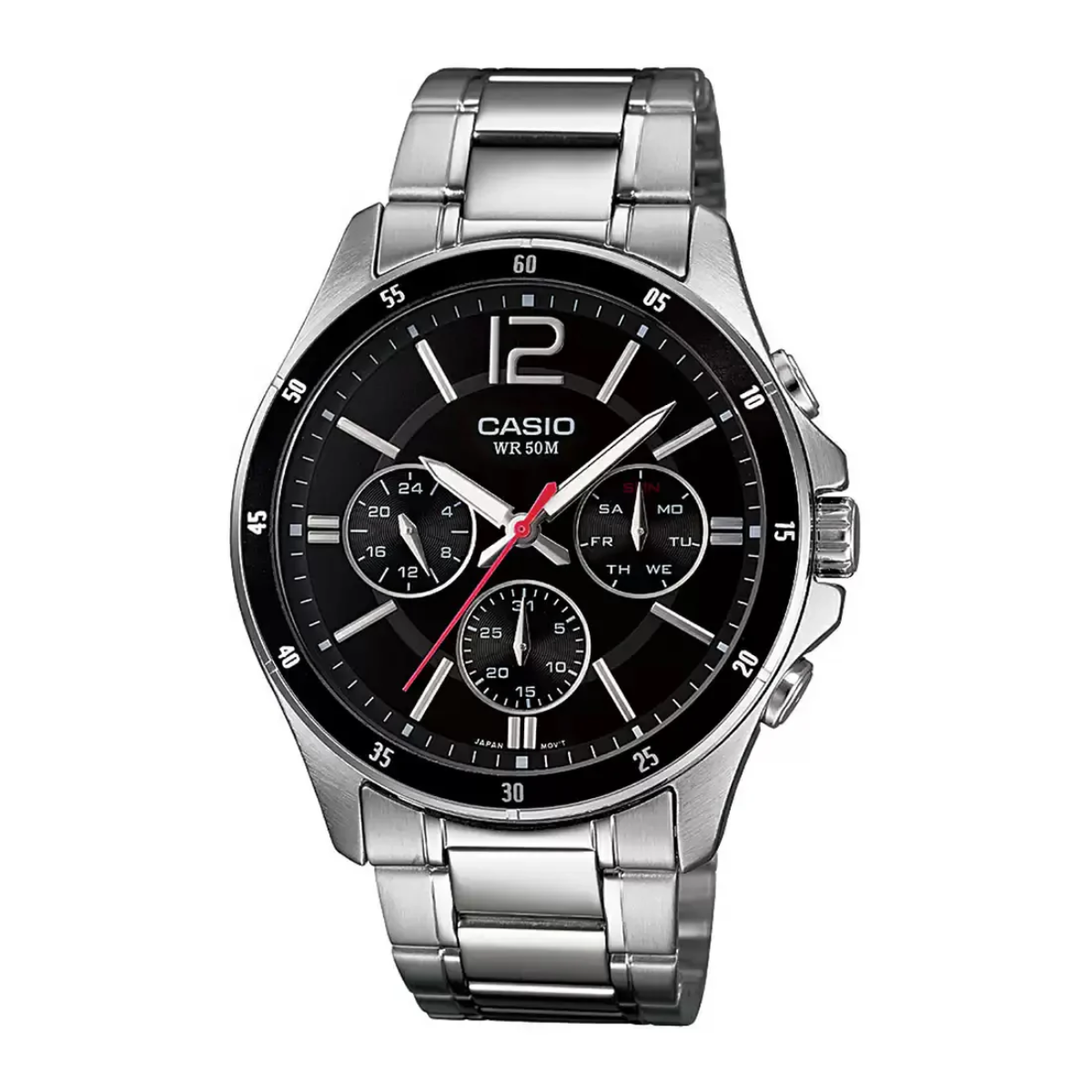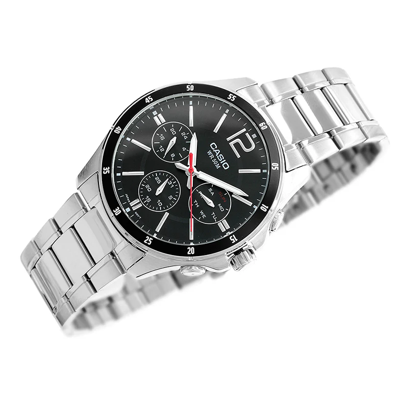 • Analog: 3 hands (hour, minute, second), 3 dials (date, day, 24-hour)