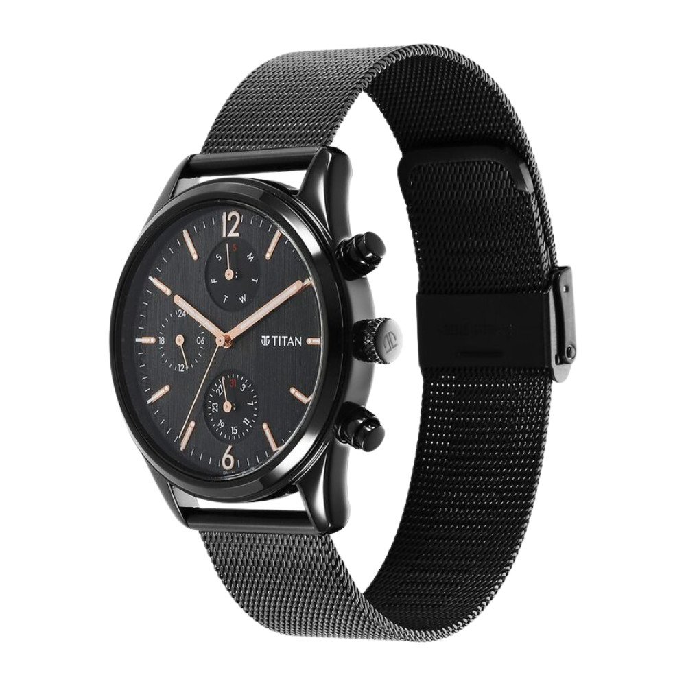 Titan Neo Black & Gold Quartz Analog with Day and Date Black Dial Stainless Steel Strap Watch for Men 1805NM05
